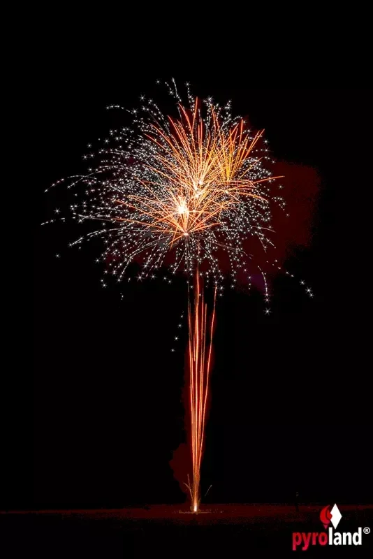 Päonien in Orange kombiniert mit weißen Blinksternen und passendem Leuchtspuraufstieg, 16 Schuss, 25 Millimeter.
